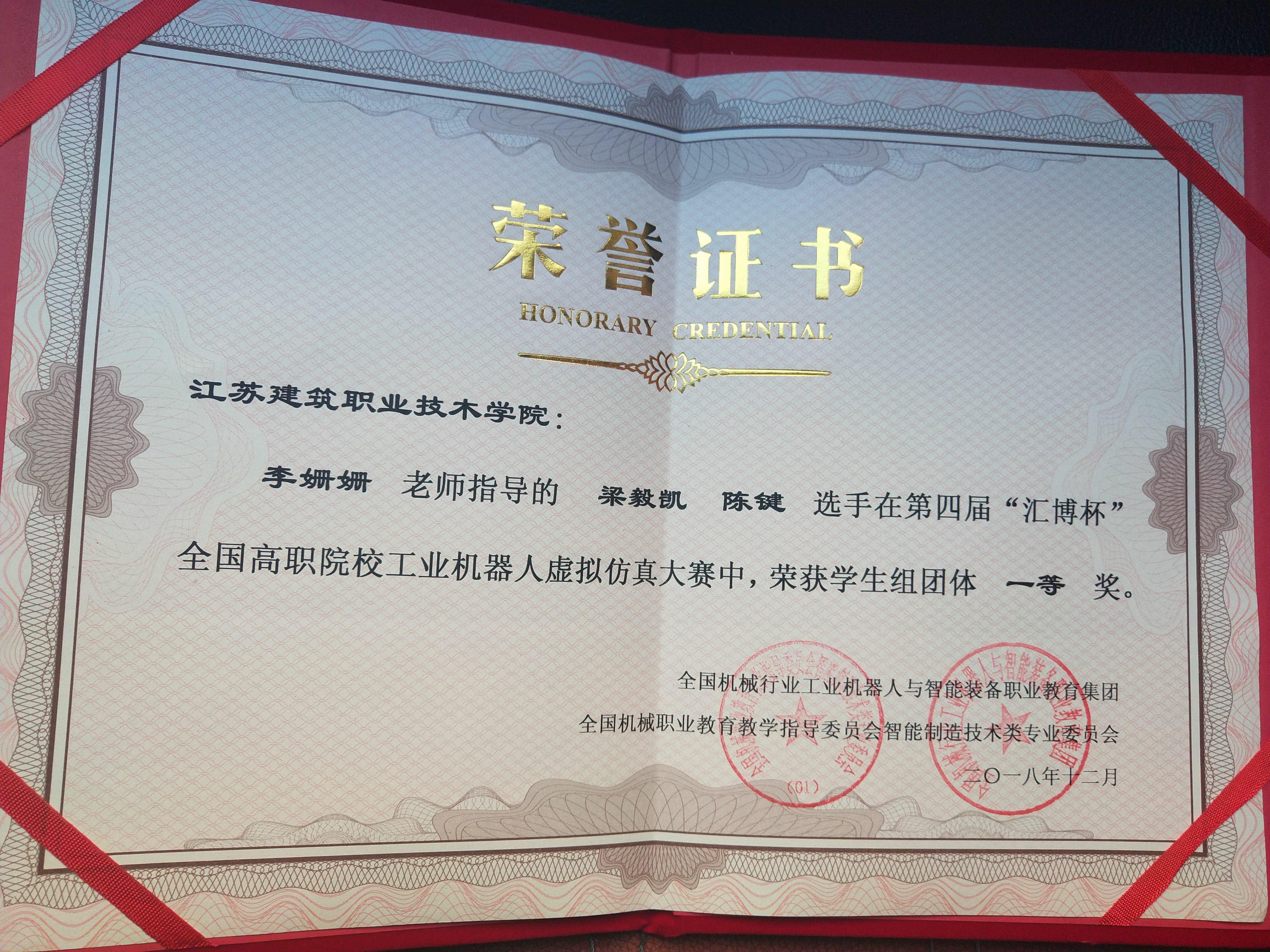 第四届“汇博杯”全国高职院校工业机器人虚拟仿真大赛于12月26日到29日在江苏省常州市举行,我校新利18官方网站多少派出由李姗姗老师、机器人17班陈键、梁毅凯组成的3人组成的师生团队参加工业机器人系统虚拟调试赛项的比赛。他们积极学习比赛相关知识,积极备战,最终在比赛中取得了一等奖的好成绩。