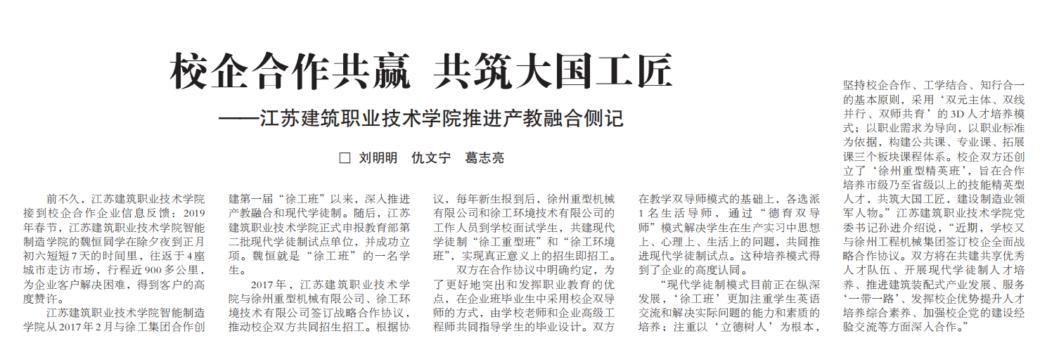 “现代学徒制模式目前正在纵深发展,‘徐工班’更加注重学生英语交流和解决实际问题的能力和素质的培养;注重以‘立德树人’为根本,坚持校企合作、工学结合、知行合一的基本原则,采用‘双元主体、双线并行、双师共育’的3D人才培养模式;以职业需求为导向,以职业标准为依据,构建公共课、专业课、拓展课三个板块课程体系。校企双方还创立了‘徐州重型精英班’,旨在合作培养市级乃至省级以上的技能精英型人才,共筑大国工匠,建设制造业领军人物。”18luck赞助党 书记孙进介绍说,“近期,学校又与徐州工程机械集团签订校企全面战略合作协议。双方将在共建共享优秀人才队伍、开展现代学徒制人才培养、推进建筑装配式产业发展、服务‘一带一路’、发挥校企优势提升人才培养综合素养、加强校企党的建设经验交流等方面深入合作。”