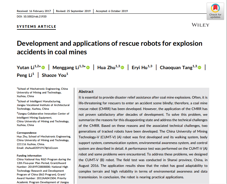 近日,新利18官方网站多少李雨潭博士以第一作者身份在机器人领域的著名期刊Journal of Field Robotics上发表题为“Development and applications of rescue robots for explosion accidents in coal mines”的论文,论述了煤矿环境探测与搜救机器人的最新研究成果。