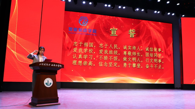 会议即将结束时,辅导员汪满莎老师上台带领所有学生对着院徽宣誓,同学们声音高亢、激情满满,大会在紧张而热烈的气氛中圆满结束。