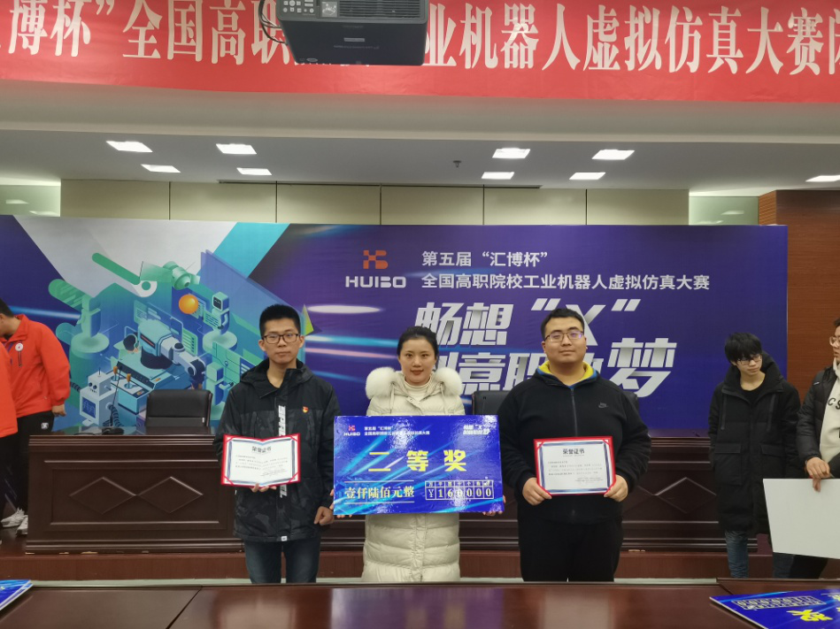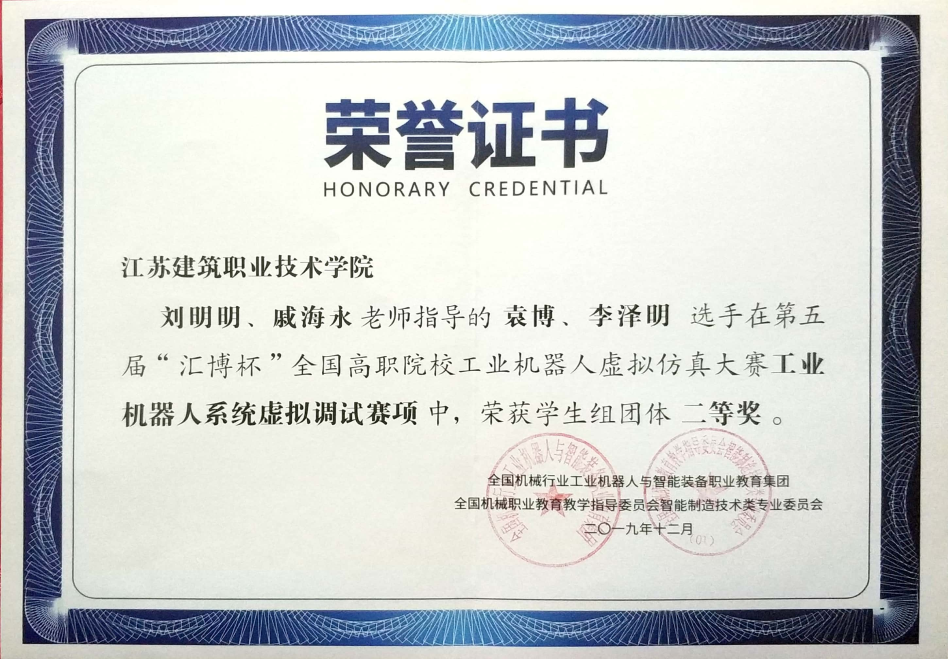第五届“汇博杯”全国高职院校工业机器人虚拟仿真大赛于12月28日在常州机电职业技术学院落下帷幕,我校新利18官方网站多少派出由刘明明、戚海永老师指导的机电17-4袁博、机制18-2李泽明组成的2人组团队参加工业机器人系统虚拟调试赛项的比赛。他们积极学习比赛相关知识,积极备战,最终在比赛中取得了二等奖的好成绩。