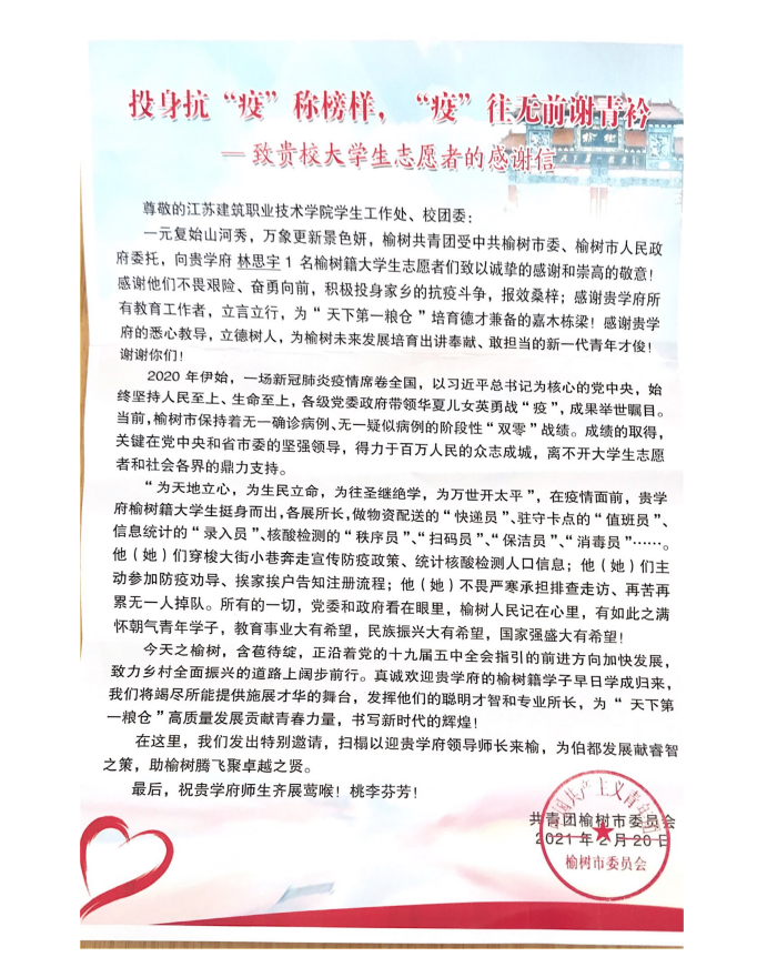 青春由磨砺而出彩,人生因奋斗而升华。2020年寒假期间,面对新冠肺炎疫情出现反扑,新利18官方网站多少机制20-1班林思宇同学不顾自身安危,积极投身家乡——吉林榆树市,参加了一场英勇的“战疫”。他不畏严寒,不挑岗位,每天工作达10个多小时,在最冷的几天里,他一个人完成了整个社区近800户核酸检测通知的张贴任务。他不顾个人风险承担了榆树人民现场的核酸检测,其突出的表现得到了家乡人民的赞扬。2020年3月15日,新利18官方网站多少收到榆树共青团发来的一封题为《投身抗“疫”称榜样,“疫”往无前谢青衿》的感谢信,信中对林思宇不畏艰险、奋勇向前,积极投身家乡的斗争表达了诚挚的感谢和崇高的敬意。