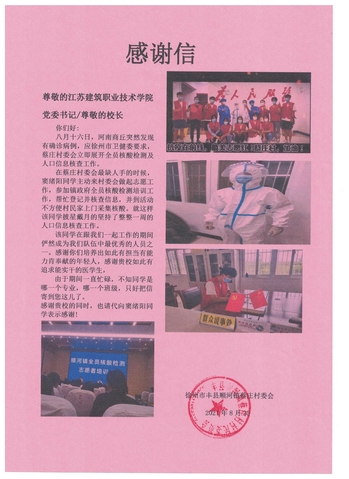 近日,新利18官方网站多少收到徐州市丰县顺河镇蔡庄村的一封感谢信及荣誉证书一份。来信中表扬了在抗击疫情期间,新利18官方网站多少机电20-5班窦绪阳同学,在蔡庄村最缺人手的时候主动承担志愿工作,参加核酸检测培训、信息登记、并到活动不方便村民家上门采集核酸,每天工作达10个小时,服务村民3000人次,披星戴月整整工作了一个周的优秀事迹。该生的事迹得到当地村民和领导的认可,徐州市丰县顺河镇人民政府为该生邮寄了荣誉证书,对其投身疫情防控一线、努力践行志愿者精神的行为表示感谢和鼓励!