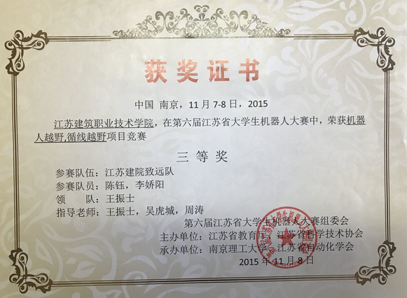 2015年11月第六届江苏省大学生机器人大赛一等奖,二等奖,三等奖