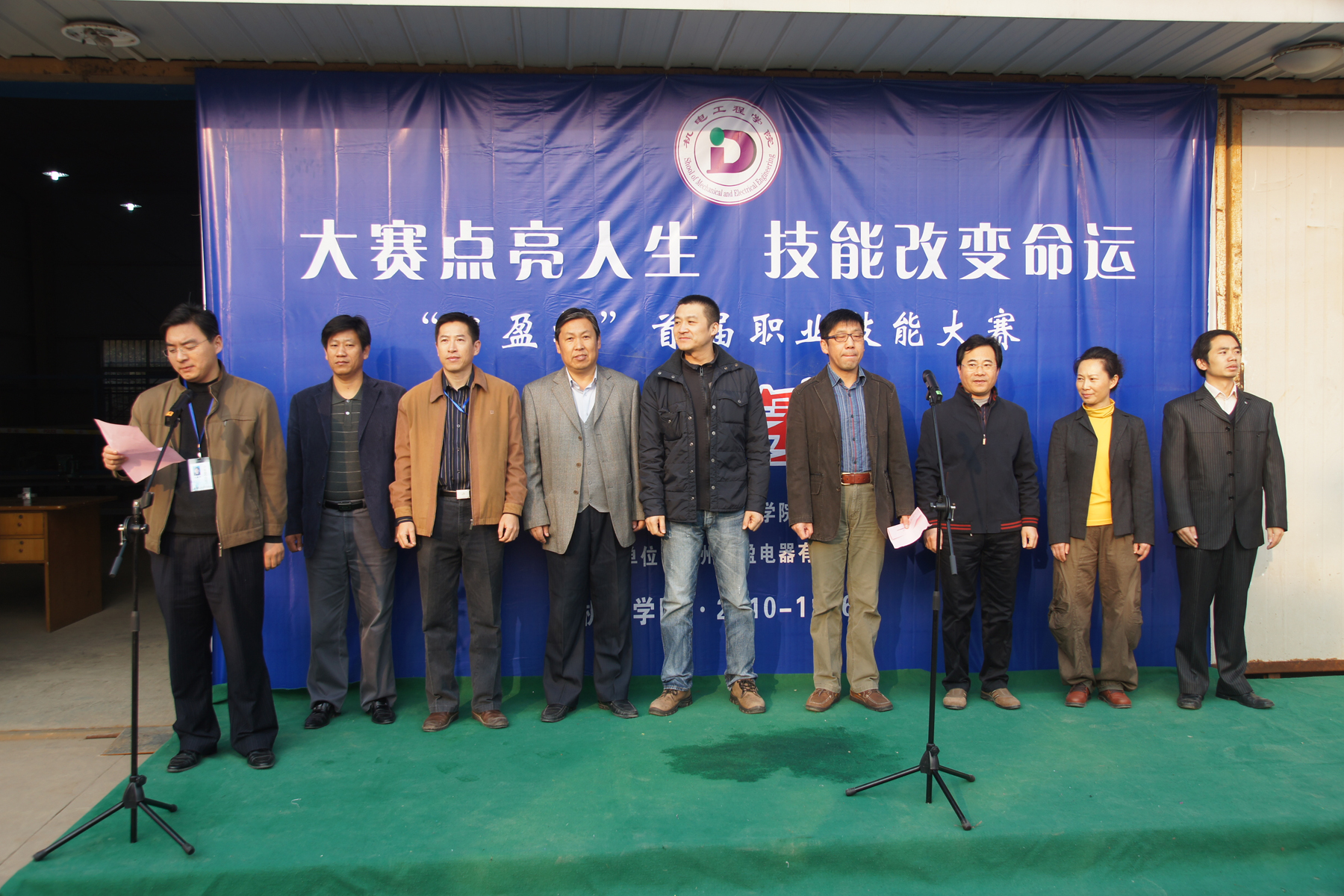 “大赛点亮人生,技能改变命运”,2010年11月6日,机电学院“日盈”杯首届职业技能大赛在机电工业中心举行,出席本次比赛开幕式的领导和嘉宾有:徐州建筑职业技术学院副校长季翔、常州日盈集团钮笑尼、学工处处长丁维华、教务处副处长贾平、宣传部副部长孙伟、机电学院院长张君伟、党总支书记潘峰、副院长赵阳培、党总支副书记朱铁壁。
