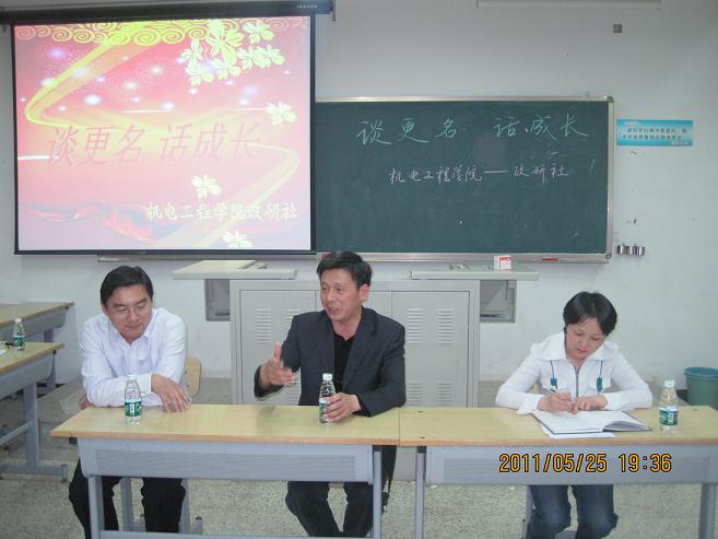 5月25日晚7点30分,机电工程学院政研社组织了以“谈更名,话成长”为主题的座谈会。本次活动特别邀请了校党委宣传部方桐清部长,机电工程学院党总支朱铁壁副书记为我院政研社全体成员做了一场生动的演讲交流。会议由政研社指导老师于馥颖主持。