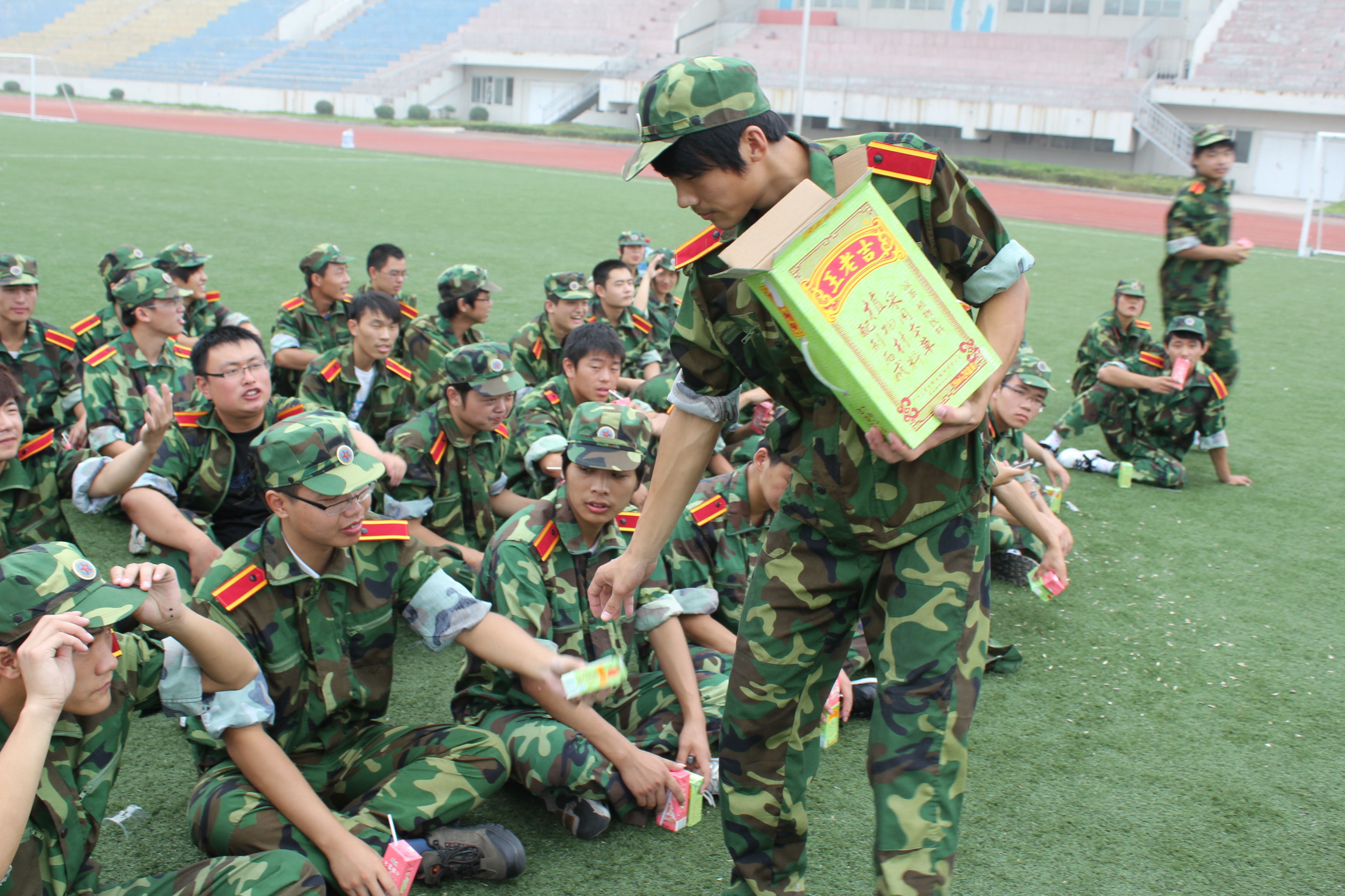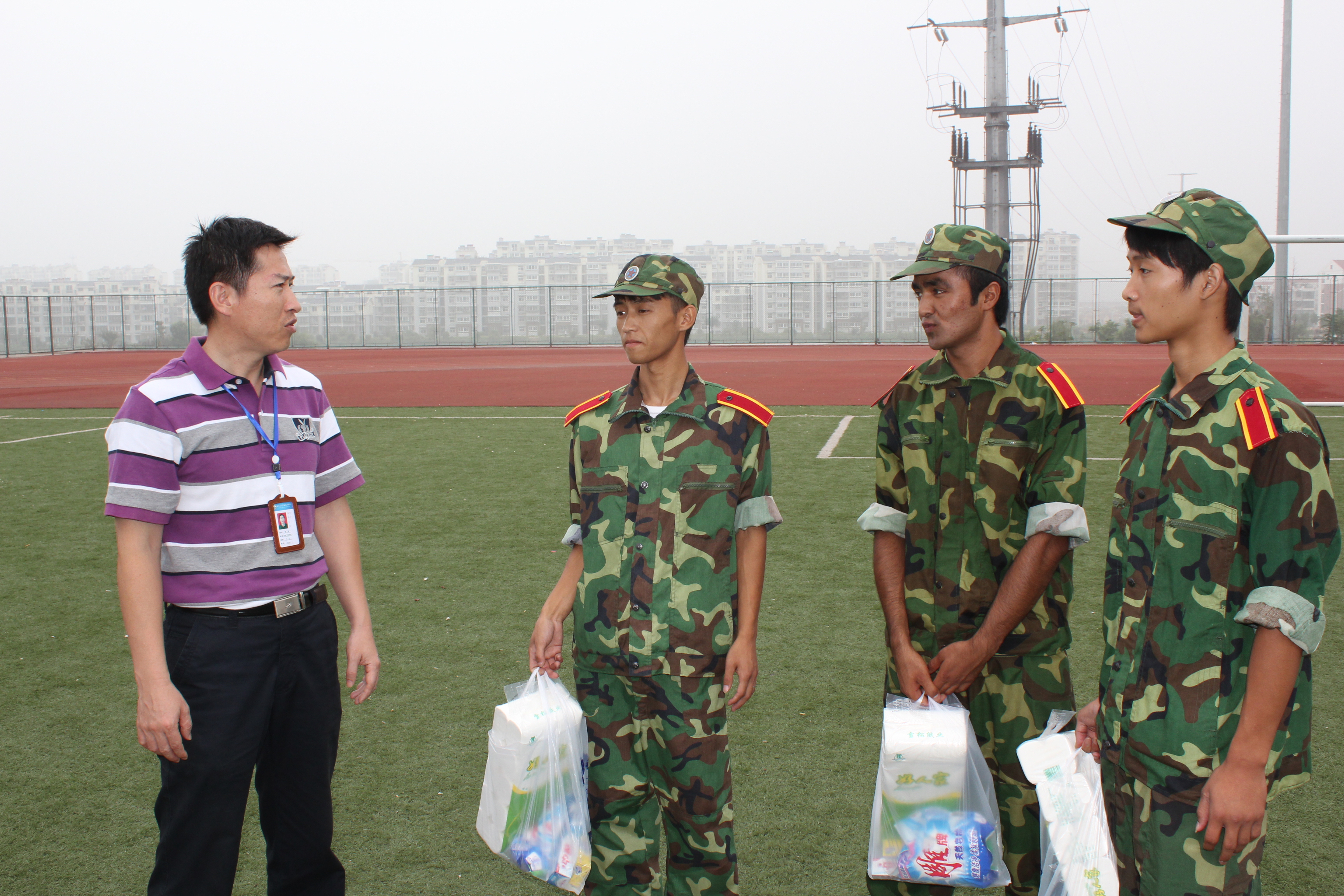 9月13日上午,机电学院党总支书记潘峰、党总支副书记朱铁壁以及专职辅导员一行看望并慰问了正在操场参加军训的教官和2011级新生。