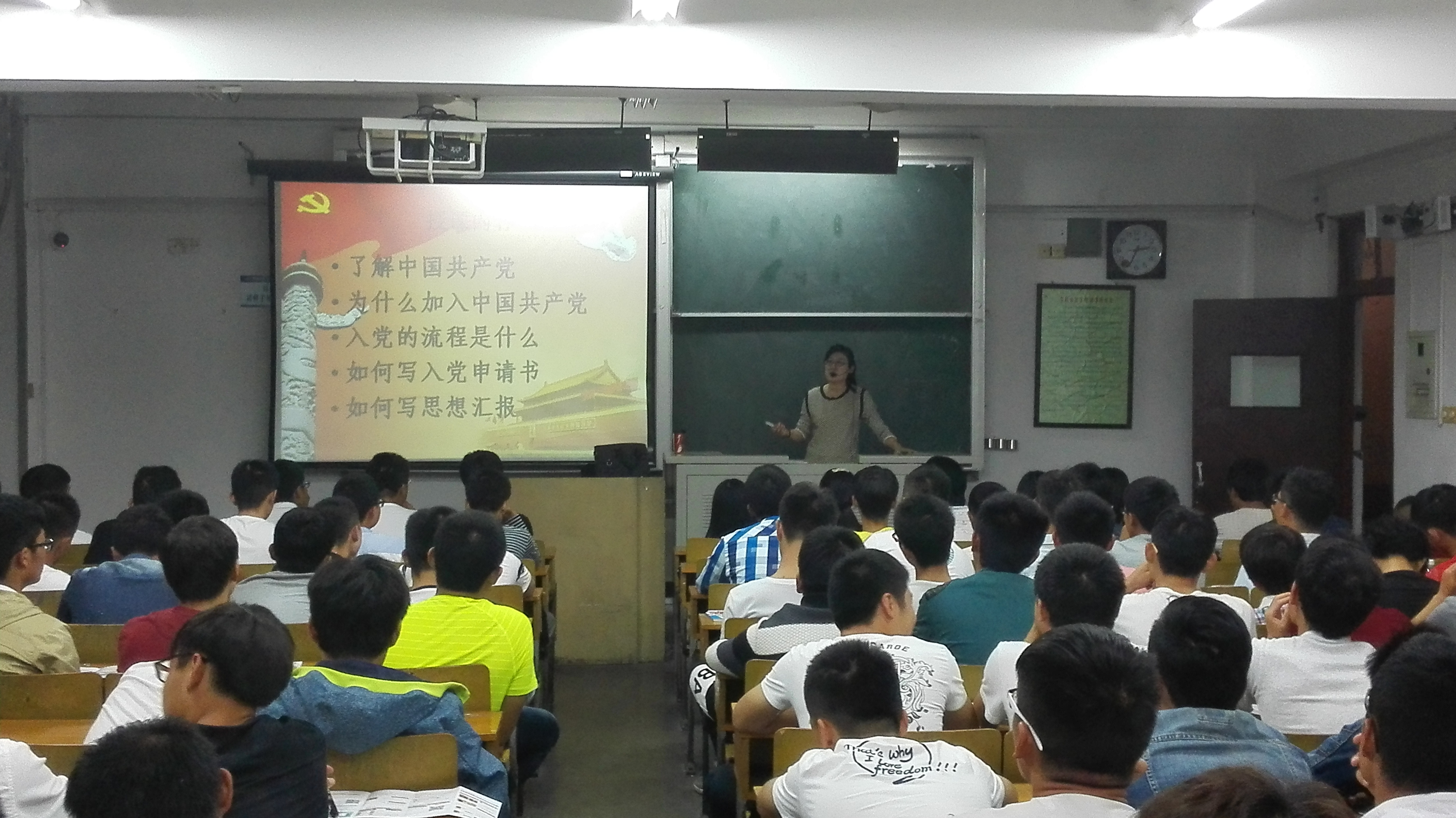 最后,邵老师明确告诉大家:入党是人一生的追求,每位同学都可以表达自己入党的意愿。但是,入党并不是意味着有特权,而是为了更好的实现自身的价值,更好的为更广大的人民服务。