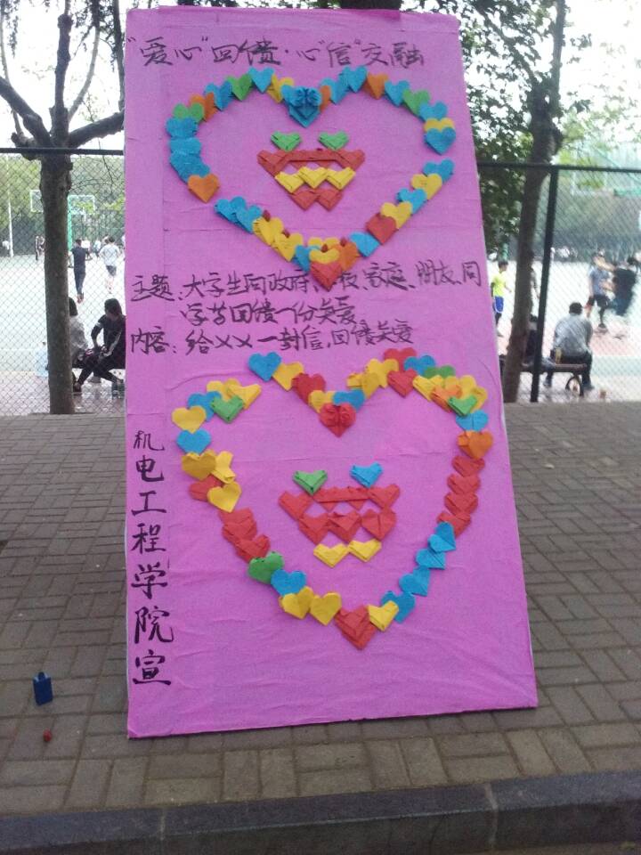 机电学院组织开展了以“给XX一封信,回馈关爱”为主要内容的心理健康教育活动,活动主要以信件的形式倡导学生向家人、朋友、同学等表达一份关怀和感激之情。心理健康教育活动调动了政府、学校、家庭等社会力量,携手关爱大学生心理健康和心灵成长,陪伴处在心理危机中的大学生顺利度过季节性、阶段性心理难关,此次引导和培养大学生向政府、学校、家庭、朋友、同学等回馈一份关爱的活动,有助于共同营造和谐校园、温馨家庭和充满友爱的社会环境。