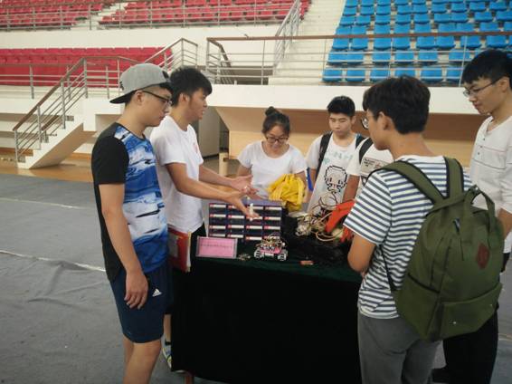 为了使新生更加了解自己的专业,认识到专业学习与实际的联系,激发他们创新思维,树立学习的信心。机电学院分团委于9月10号在体育馆内举办了科技作品展示活动。本次科技展出的展品主要有:遥控液压挖掘机模型、超声波探路小车、智能化电子元件盒等。这几件作品是机电学院大三学长在专业老师的指导下设计、制作而成。获得过国家专利授权,并在江苏省“挑战杯——彩虹人生”江苏省职业学校创新创效创业大赛中获得二等奖。迎新现场,学院选派专门的学生为感兴趣的新生讲解作品的设计思路及设计原理。并耐心的解答新生们的问题,鼓励他们只要好好学习专业知识他们会做出更好的科技作品,同时也希望他们加入自己的创新团队,为实现自己的科技理想努力奋斗。