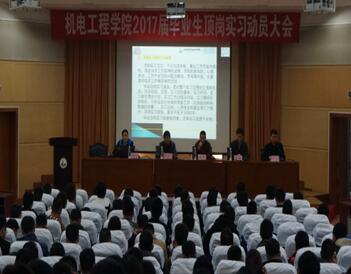 为确保我院2017届毕业生顶岗实习的顺利进行,2016年11月13日晚上,机电工程学院在学术报告厅隆重召开2017届毕业生顶岗实习动员大会。机电工程学院党总支书记潘峰、机电工程学院院长仇文宁、机电工程学院副院长李志球、党总支副书记鹿毅出席会议,参加大会的还有毕业班班主任、就业辅导员和全体2017届毕业生。大会由