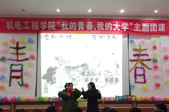 本次团课围绕主题共上演14个节目,内容丰富,形式多样。集音乐、舞蹈、小品、朗诵为一体。每一位上台的演员都在演绎自己的青春,每一个青春都有一个故事,每个故事都有一个遗憾,每个遗憾都有它的青春美。小品《看病》逗得同学开怀大笑,穿着军大衣的女同学更是让在座的同学竖起了大拇指,模具班蒋金孛同学带来的手风琴更是让观众赞不绝口,还有独唱《一次就好》、《十年》等节目,展现出了我们机电学子青春的活力,蓬勃的朝气。接下来的吹气球互动环节更把同学们的热情推向了高潮。台上一分钟,台下十年功,在座的同学都把最热烈的掌声献给了这些舞台上最可爱的同学。