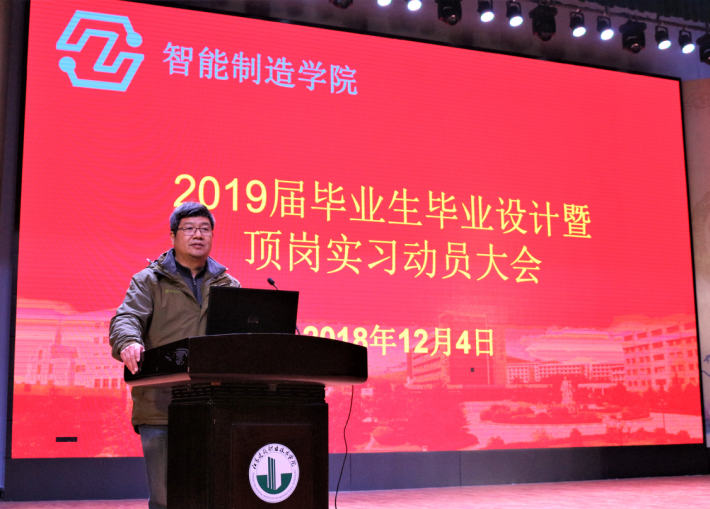 为确保我院2019届毕业生毕业设计和顶岗实习的顺利进行,2018年12月4日,智能制造学院在会堂隆重召开2019届毕业生毕业设计暨顶岗实习动员大会。新利18官方网站多少院长仇文宁、新利18官方网站多少副书记李珂出席会议,参加大会的还有毕业班班主任、就业辅导员和全体2019届毕业生。