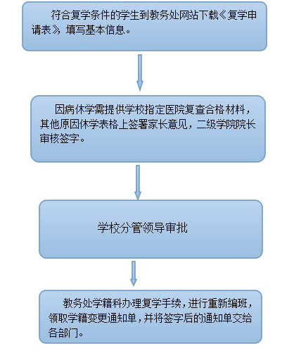 (1)休学期满需复学的学生,应于学期开学前向学校提出复学申请。对因伤、病休学者,需经学校指定医校复查合格后,经二级学院同意,教务处审核,学校批准,方可复学;对其他原因休学的学生,须附家长意见,经二级学院同意,教务处审核,学校批准,方可复学。教务处 对其进行编班。