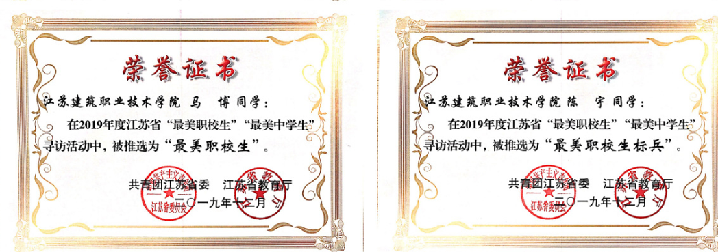 近日,在2019年度江苏省“最美职校生”寻访活动中,我院机电17-4班陈宇获“最美职校生标兵”称号,机制17-1班马博、获得“最美职校生”称号。