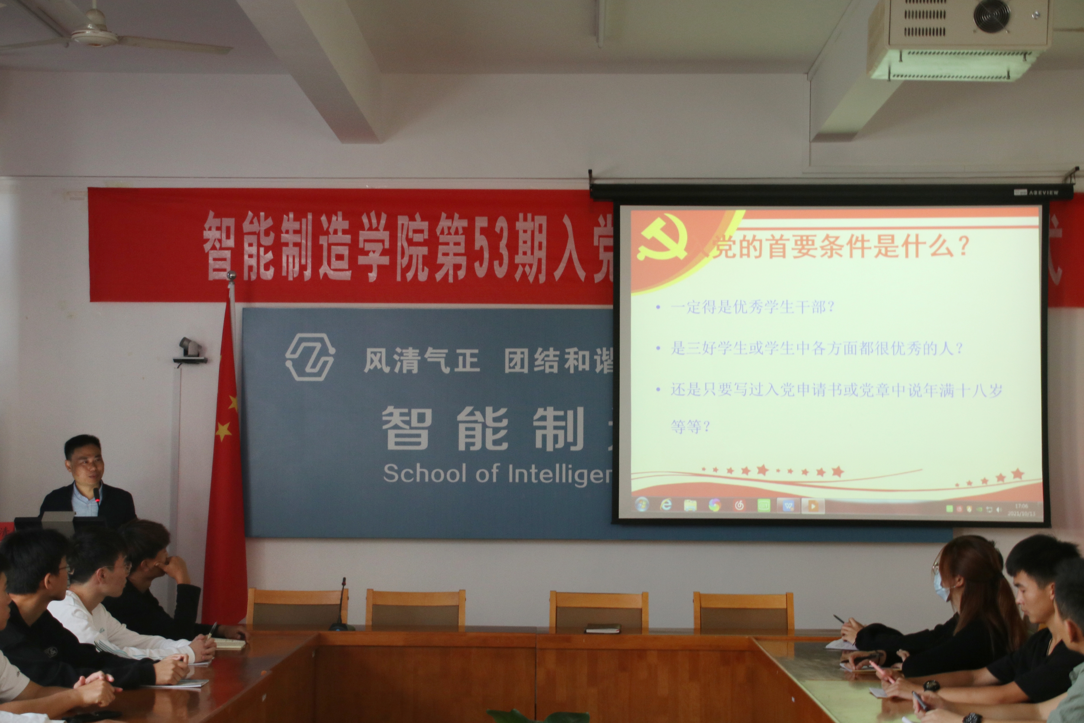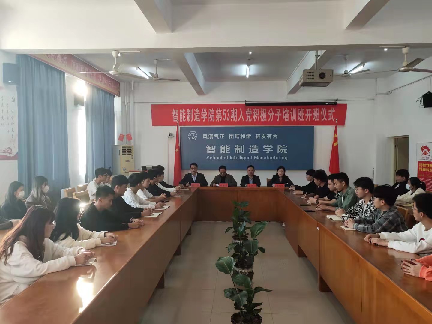 20211013下午,新利18官方网站多少第53期党校培训开班仪式在第一实训楼504隆重举行。智能制造学院党总支书记刘盛贤、副书记王凤清学生科科长邵明颖、办公室主任胡兵出席仪式,仪式由胡兵主持。