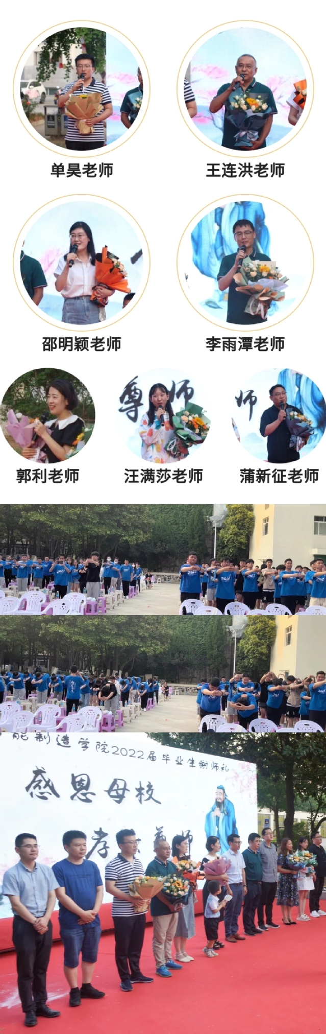 典礼还特别安排了“感恩母校、孝亲尊师”谢师环节,全体毕业班班主任带着笑和泪水为在场的毕业生送上最真挚的祝福,老师们的谆谆教诲变成了临行前最珍贵的礼物。随着主持人的一声“全体肃立”,谢师开始:“一拜师道尊严,立人立德。二拜传道授业,教化解惑。三拜感念师恩,天地为鉴。”这行礼间,不仅表达出学生对母校、对老师的感恩与不舍之情,更是显现出我院长期致力于优秀传统文化与现代职教体系有机融合的良好成效。