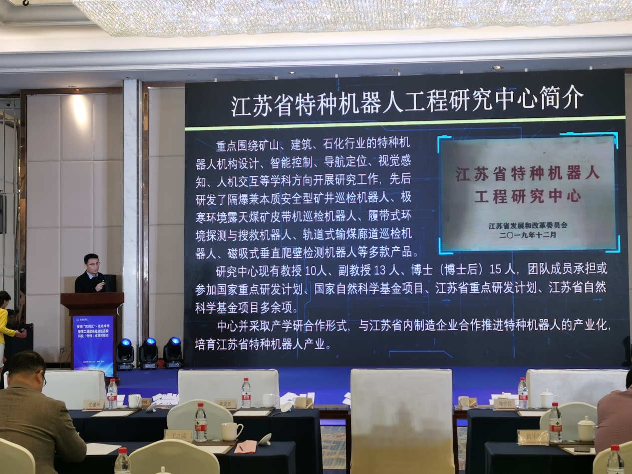 李雨潭博士代表我校以“一种隧道二衬台车涂油机器人”项目进行了路演,并对我校江苏省特种机器人工程研究中心向出席对接会的专家和嘉宾进行了介绍,取得了良好的效果。本次活动组织了淮北市“五群十链”重点企业、科技企业孵化器、创新创业企业代表现场开展技术需求对接,并组织召开了淮海经济区高校技术转移联盟工作研讨会。