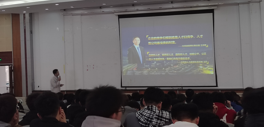 在教三西阶梯教室,校企双方共计三百余人参加了宣讲会。咸赛杰对同学们的到来表示欢迎和感谢,并对当前的就业形势与政策作了简单地介绍和分析。互动环节中,学生们针对自己关心的专业对口、企业需求、实习待遇、个人发展平台等问题进行了咨询,咸赛杰详细介绍了比亚迪公司对新型学徒制人才的培养目标、过程、方案、具体措施等。