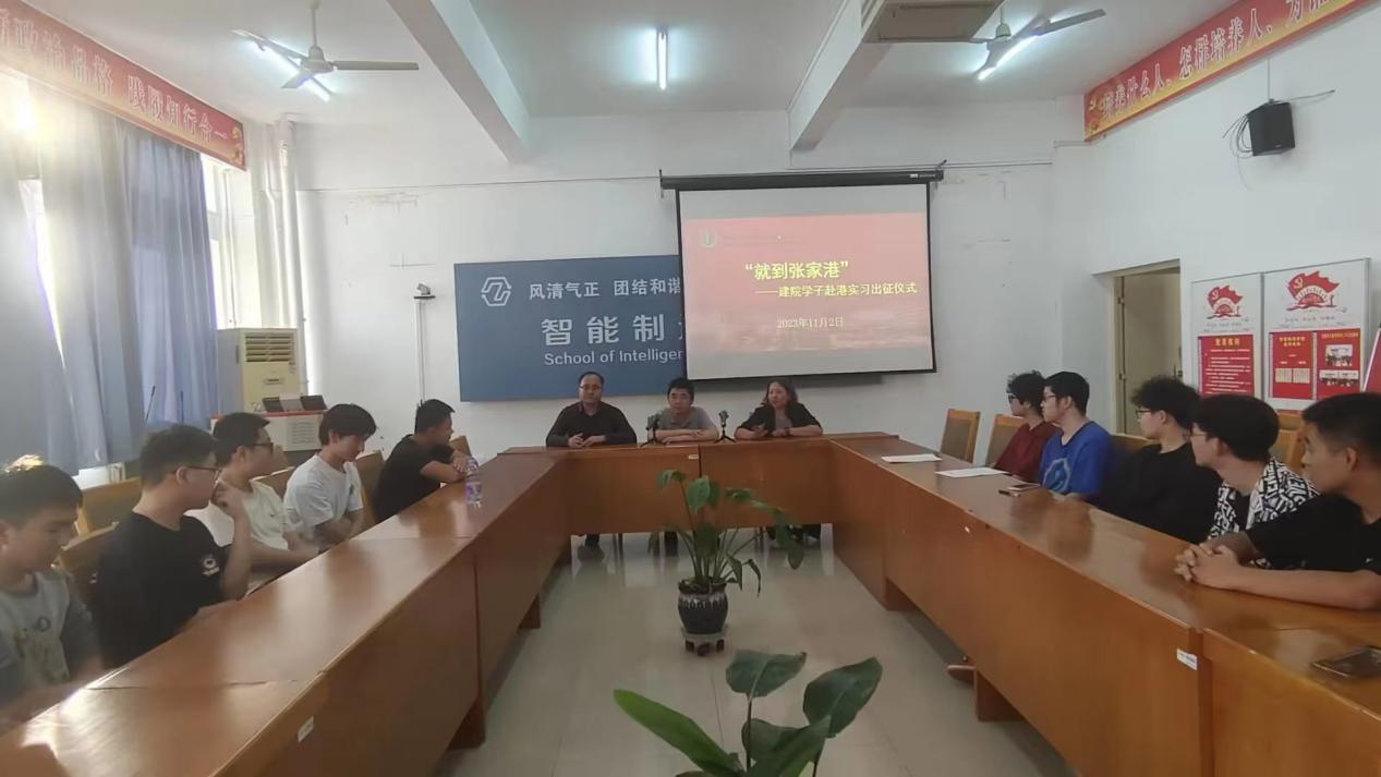 2023112上午智能制造学院在第一实训楼会议室举行2023毕业生赴张家港实习出征仪式。学院党总支书记王正扬、副院长付红招就处副处长周磊以及2024十余名学生出席本次出征仪式
