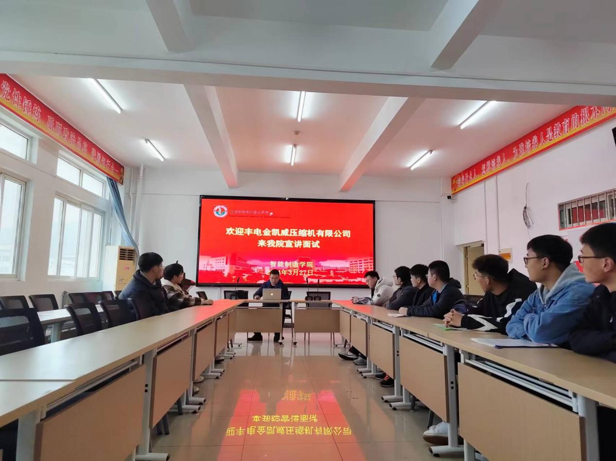 为了进一步深化产教融合,提升人才培养质量,促进学生更加充分更高质量就业。2024年3月27日下午,新利18官方网站多少联合丰电金凯威(苏州)压缩机有限公司在第一实训楼504开展了宣讲面试工作。公司市场部潘经理进行了现场宣讲面试,意向毕业生二十余人参加。