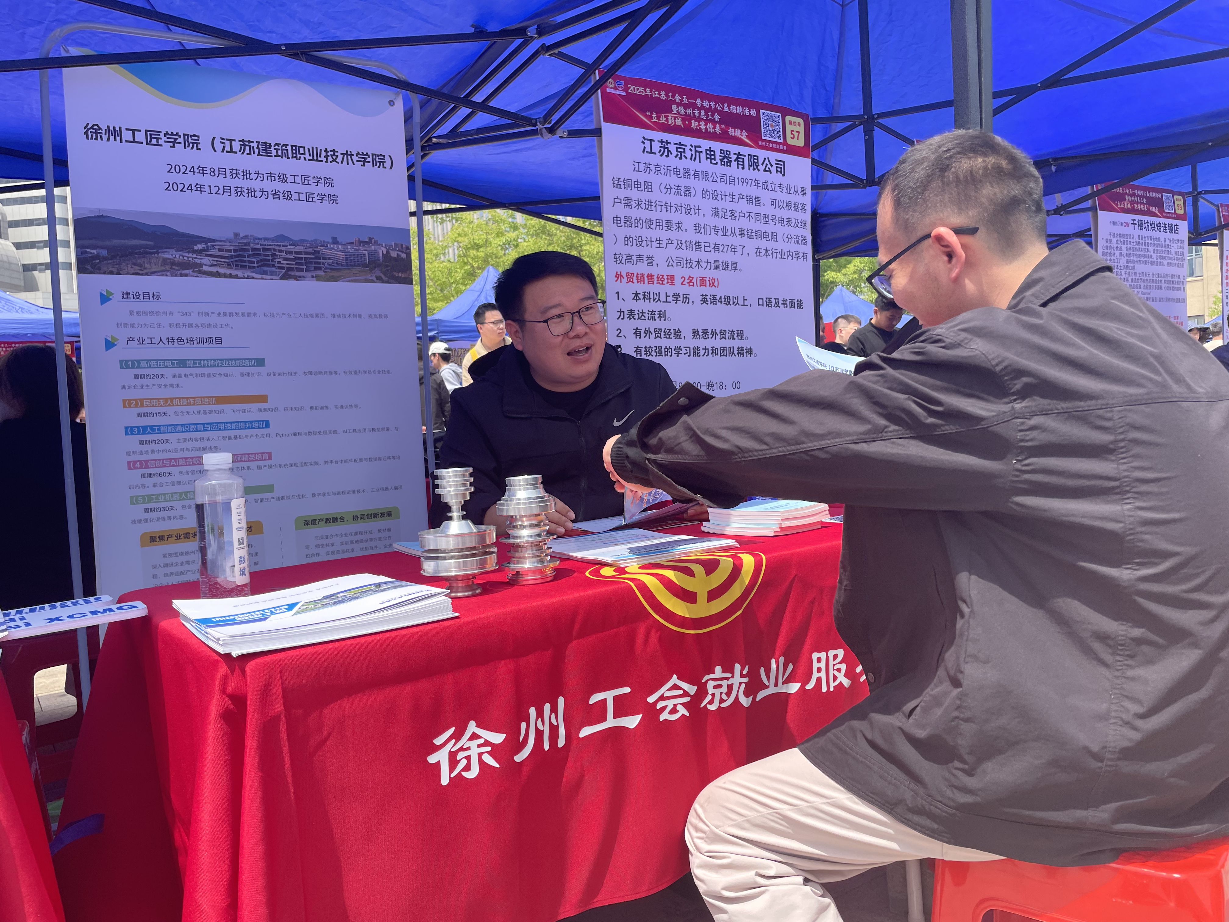 2025 年4 月27 日,由江苏省总工会与徐州市总工会联合举办的“立业彭城·职等你来”2025 年江苏工会五一劳动节公益招聘活动在泉山区淮海西路市展览馆门前广场顺利举行。徐州工匠学院(18luck赞助)积极响应号召,深度参与本次招聘会,为促进人才就业与企业用人需求的精准对接贡献力量。