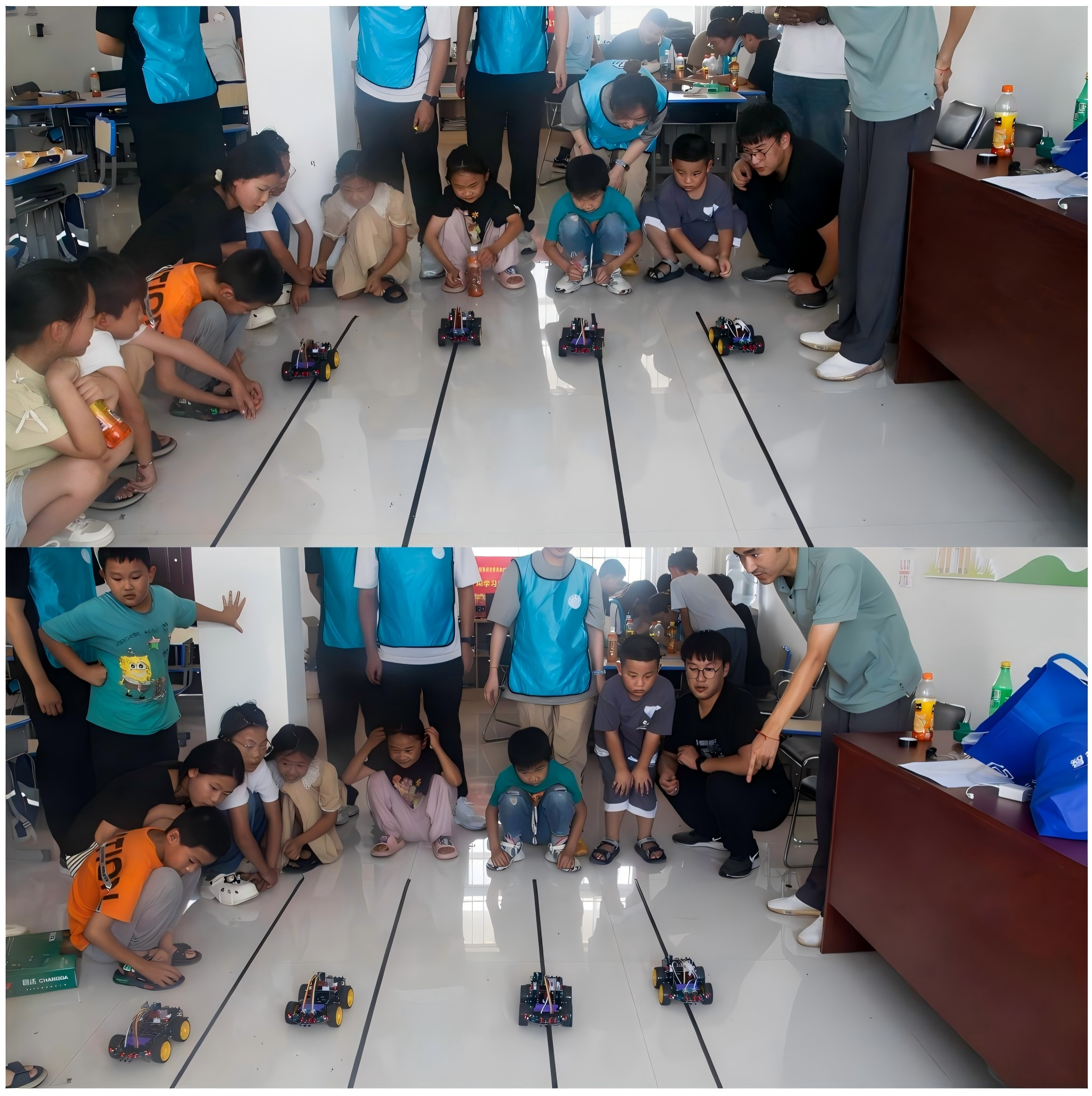 活动高潮聚焦循迹小车竞速赛。四支队伍携自主调试的“战车”展开智慧角逐,赛场欢呼与惊叹交织。这场别开生面的“乡村科技运动会”不仅检验了前期学习成果,更在竞技中点燃科技梦想,让少年们切身感受智能时代的澎湃动能。