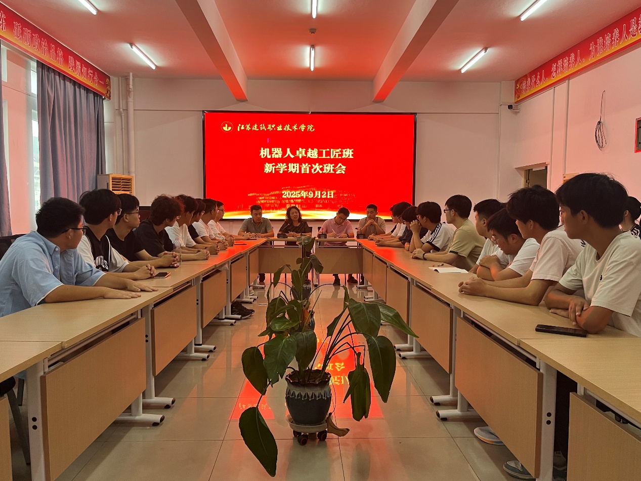 2025年9月2日,新利18官方网站多少23级和24级机器人卓越工匠班新学期首次班会在第一实训楼504会议室召开。院长付红、副院长李雨潭、专业负责人赵戈及学业导师王勇出席会议,与全体学生进行深入交流。